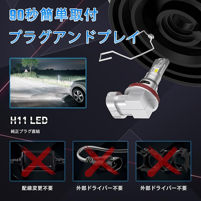 【ポン付け、取付簡単】コンパクトなオールインワンミニサイズで、かさばるベース不要、追加のドライバーも不要。プラグアンドプレイ対応で、マイクロ秒で点灯します。H11/H8 LEDヘッドライトバルブは極性があります。取り付け後点灯しない場合は、水平に回転させて再度お試しください。