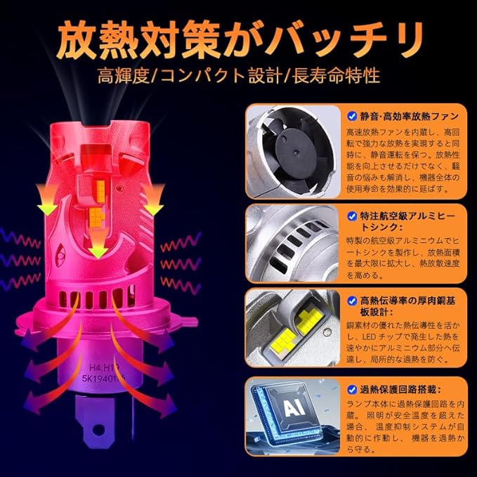 【四重放熱 50000時間長寿命】 h4ヘッドライト バルブは、一体成型の航空級アルミニウム合金ボディに、高速冷却双重ファンと高熱伝導銅基板を組み合わせた三重放熱システムを採用。LEDチップの発生熱を効率的に排出し、高温環境下での光衰えを抑制し、長寿命と安定した性能を保証します。