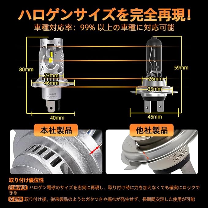 【純正1:1 ポン付け簡単取付】 このh4 LEDライトは、純正ハロゲンバルブとサイズ設計。DC12−24V車両に適用したもので。複雑な配線や車体改造は一切不要。無極性設計でプラグを差し込むだけの簡単ポン付け。誰でも短時間で純正交換が完了します。