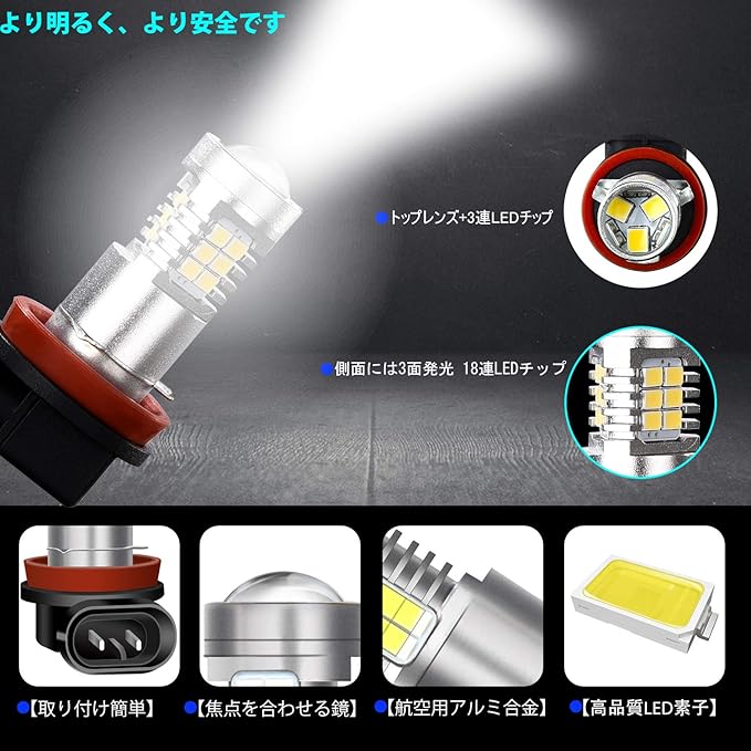 ●【6500K白光&高ルーメン】LED フォグランプ H11 DC 12V専用。上部は凸レンズ付きで には3連のLEDチップ、照射距離が遠く、光が集中して分散しない。側面には3面発光の全方位照射を行った。雨や霧のときも見通しやすい!