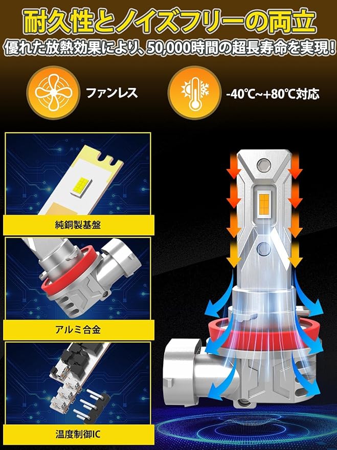 【ノイズゼロ・高耐久モデル】本製品はファンレス設計を採用し、究極の静音性を追求しました。バルブ本体に航空用アルミ素材を採用し、精密なスリット加工(透かし彫りデザイン)によって、熱を素早くかつ効率的に拡散します。優れた熱伝導性を持つ純銅製のチップ基板を採用し、LEDチップから発生する熱を効率的に放出。高出力を維持しながら、チップ寿命を大幅に延ばします。長寿命で、音のストレスもなく、ファンの故障リスクもない。まさにストレスフリーなLEDヘッドライトです!