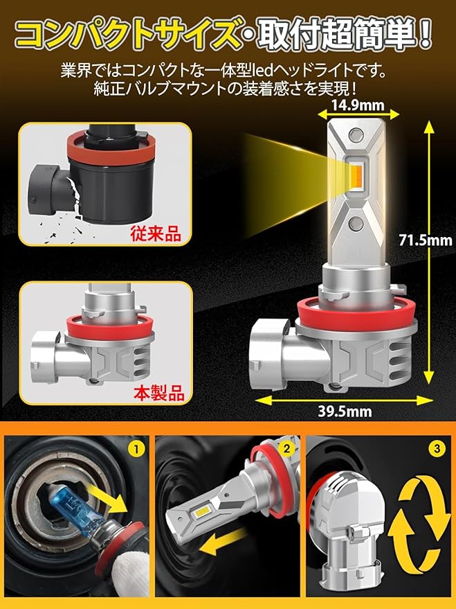 【高効率CSPチップ・3000Kイエロー】H11LEDフォグランプは発光効率に優れたCSPLEDチップを採用することで、発光色・配光・光度において、かつてないレベルの向上を実現しました。 発光色は3000LEDイエローで、純正ハロゲンバルブや白色光よりも視認性が優れています。雨の日や曇り空などの悪天候でも視界がよく保たれます。LEDヘッドライトの本体にはアルミニウム合金を採用し、一体型な設計と優れた省エネ・放熱効果により、耐久性が飛躍的に向上しています。XELORDの新型H11 LEDフォグランプは、コストパフォーマンスと実用性を極限まで追求したモデルです。