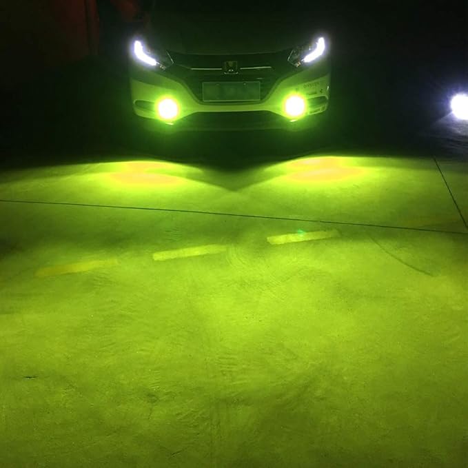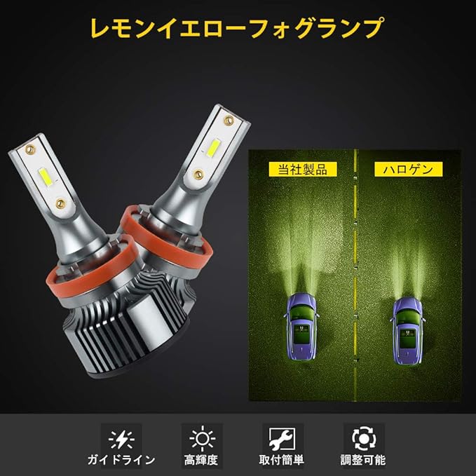 【信頼安心CSPチップ】高輝度のCSPチップを使うわけで、品質、安定性に優れ、その他に大事なのは耐久性にも期待できるんでしょう。綺麗なレモンイエロー(緑がかった黄色)は発光色で、雪道・雨天・濃霧の様な視界の悪い天候に威力を発揮します!!それに驚くほどの明るさの他に、グレアも出ないので対向車に優しいです。見た目だけでなくフォグランプ本来の役割を果たします!!