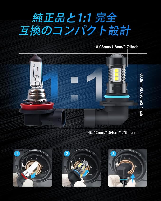 【簡単取り付け】工具不要!当社のH11 H8 H9フォグライトバルブは無極性ソケットとゼロ距離接続システムを採用し、かさばるアダプターが不要。旧バルブの交換がわずか5分で完了。複雑な配線作業や追加ドライバーも必要ありません。