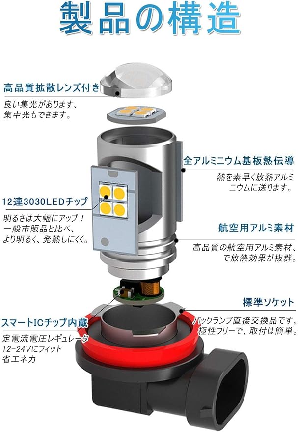 超高輝度 全方位照射:このh11 ledフォグランプ超高発光効率の3030SMD LED素子12連搭載。上部は4連、周りは8連、拡散レンズ付きで光線を集中でき、照射距離を増やせる、本気の360 全方位照射でき。市販のハロゲンより省エネルギーの上で、明るさは大幅にアップ!