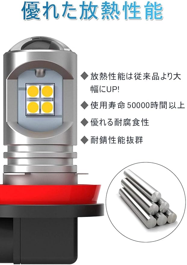 耐熱抜群 長寿命:このh8 ledフォグランプ本体は耐熱性と放熱性に優れたアルミ素材と専用なガラスファイバー基板を使用する事により、チップの使用寿命を長引かせる事が可能となりました。このh11 ledフォグランプ本体は耐熱性と放熱性に優れたアルミ素材と専用なガラスファイバー基板を使用する事により、チップの使用寿命を長引かせる事が可能となりました。