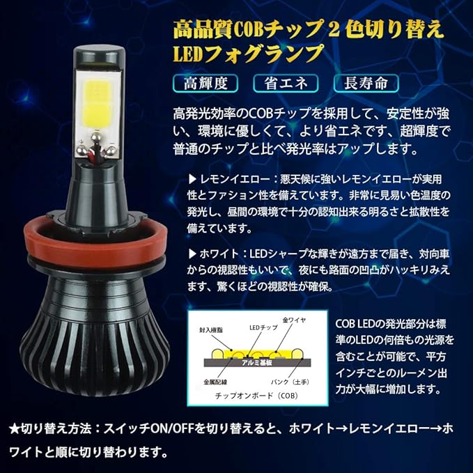 LEDフォグランプ H8 H11 H16 LED フォグ バルブ レモンイエロー ホワイト 2色切り替え LEDバルブ 12V 車用 LED フォグランプ イエロー 黄色 白 2色 LEDライト 明るい COBチップ 2個入