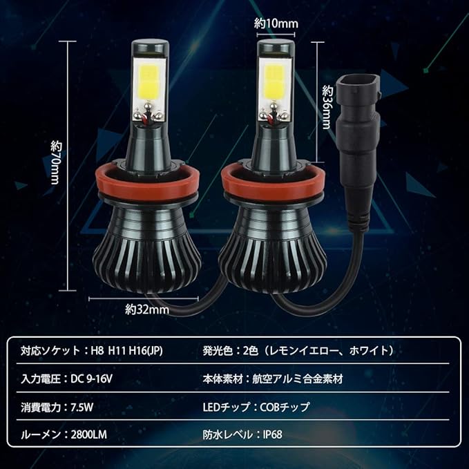 ◆【製品仕様】対応ソケット:H8 H11 H16(国産車)、消費電力:7.5W、入力電圧:DC 9V-16V、ルーメン:2800LM、発光色:2色(レモンイエロー、ホワイト)、チップ採用:COBチップ搭載、本体素材:航空用6063アルミ素材、防水等級:IP68(雨の日も安心します)。