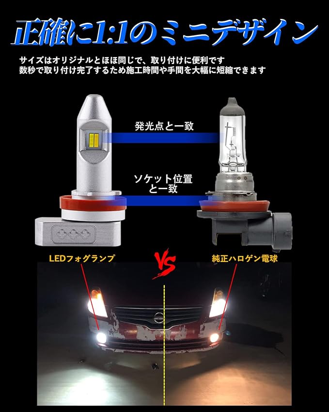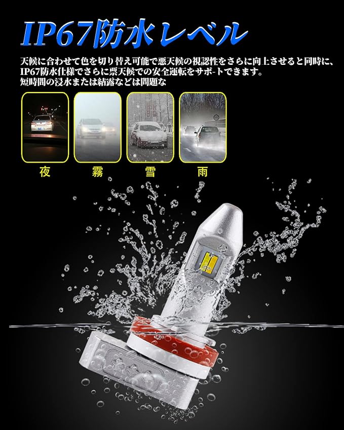 【IP67防水と取付簡単】本当の一体型&配線なし!差し込むだけで完成!取り付け超簡単!スペースが狭い車でも取付でき!H8 / H9 / H11 / H16(国産車)の純正球と交換して、直接交換できます。IP67レベルの優れた防水・防塵性能で、粉塵と雨水の侵入を有効に防止して、様々な天候でもドライブを安全、快適に!より長い使用寿命を実現しました!