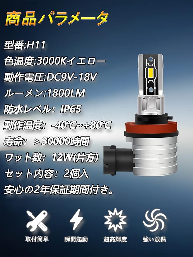 【製品仕様】 LED フォグランプ 型番:H8 H11 H16 兼用LEDバルブ。色:イエロー/3000K ワット数:12W 明るさ:1800lm セット数:2個 電圧:DC9~18V 動作環境:-40 ~80 使用寿命:50000時間以上 防水等級:IP65 保証:保証期間2年。ご注文日から2年以内に不具合や不具合が発生した場合は、いつでもご連絡ください。責任を持って対応いたします。