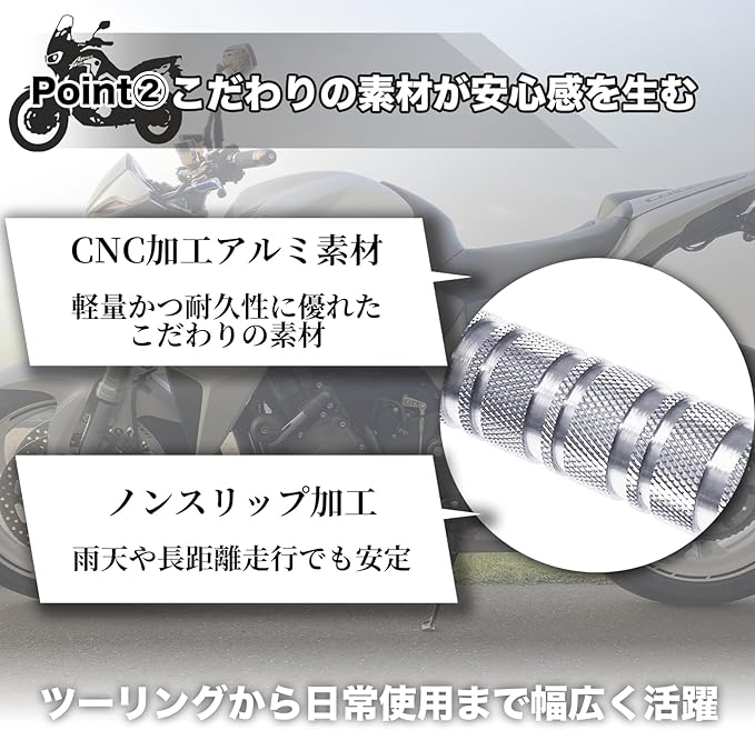 ✅【耐久性 操作性!アルミステップ】こちらのバイクステップはお好みのステップ位置に調整が可能です。またCNC加工アルミ素材により軽量かつ耐久性に優れています。表面にノンスリップ加工を施し、雨天や長距離走行でも安定感を確保。堅牢な設計でツーリングから日常使用まで幅広く活躍します。