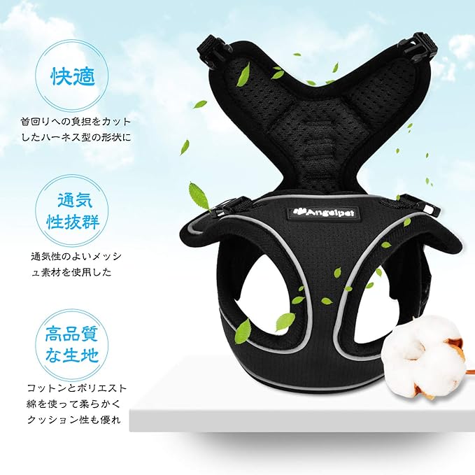 【ソフトタッチと通気性抜群】内側はソフトタッチと通気性のよいメッシュクッションなので、摩擦を避けて肌をやさしく守れます。空気と通す穴が無数に開いており、速乾性も通気性も抜群なので暑い季節にも長時間装着ても快適。フランネルで縫製されたソフトエッジは摩擦による痛みと炎症を大幅軽減できす。バージョンアップ版の多機能リードはハーネス本体と同じメッシュ素材のソフト持ち手、握り心地が良いです。バックル機能追加で、リード延長が可能です。