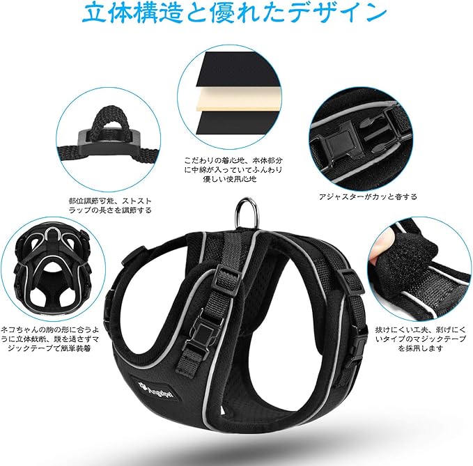 猫 猫用 ハーネス 胴輪 猫具 ねこ ネコ 子猫 子犬 小型犬 散歩 お出かけ 抜けない ベスト ソフト胸あて 軽量 頭を通さずマジックテープで装着 サイズ調節可 夜反射 通気メッシュ (Sサイズ (x 1), ブラック)