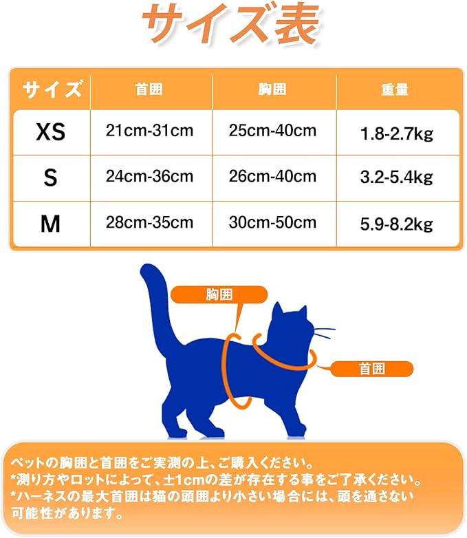 {サイズと色の選択}➡{気分はまるでオーダーメイド} XS:首回り:21~31cm 胴回り:25~40cm / S:首回り:24~36cm 胴回り:26~40cm / M:首回り:28~35cm 胴回り:30~50 cm。付属リードの長さは150cm、すべてのサイズで同じです。さまざまな成長段階のペットに適しています。ペットの実際サイズをご実測の上、ご購入ください。 5色のカラー(黒、青、ピンク)と3サイズ(XS、S、Mのからお選びいただけます。お好きな色とピッタリのサイズをチョイスできますので、まるでオーダーメイドのようなおしゃれなマイハーネスを手に入れられます。※サイズには多少の誤差がある場合がございますがご了承ください。