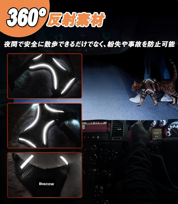 {耐久性と夜間の安全性を兼ね備えた}➡{使用安心} 薄暗い場所や夜間の使用中視認しやすいように、首元と胴回りにはくっきりと発光する反射素材を使っており、夜間の散歩中に車や自転車のライトを反射 し、ペットの視認性を高めて安全を確保できます。夜になっても猫ちゃんとより安全に楽しくお散歩できます!繋げる部分にあるDカンとナスカンの留め具は耐衝撃性に優れた亜鉛合金製なので、高い引張強度があり、丈夫で錆も強いで安心してお使い頂けます。付属の猫リードと合わせて使用することで、より効果的なコントロールが可能となり、迷子の防止にも役立ちます。普段の散歩 、 外出 、災害時の避難用としても大活躍します。