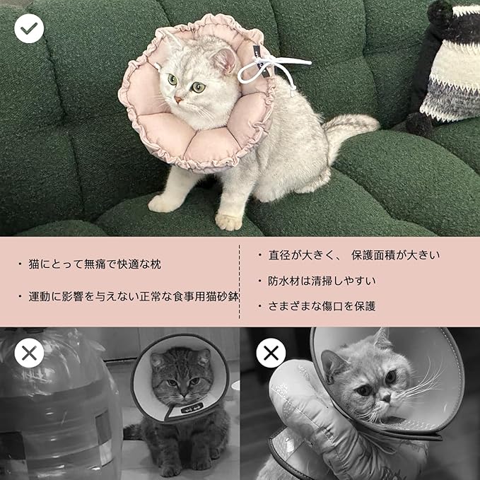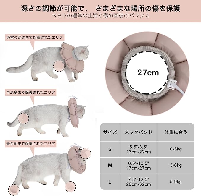 「病後の回復を早める」 猫エリザベスカラーは、術後の傷口の保護、かぶれや術後の傷の保護、ペットがケガや手術した部位を噛んだり舐めたりするのを防ぎ、手術や傷の回復を促します、また、外部駆虫、皮膚科の傷の治療、爪切り、猫の毛のグルーミングなど、日常的に使用される、このエリザベスカラーは基本の大きさに加えて、深さを調節できるように改良したんだ。足や頭のケガでも、ちゃんと治りをサポートできるようになったよ!