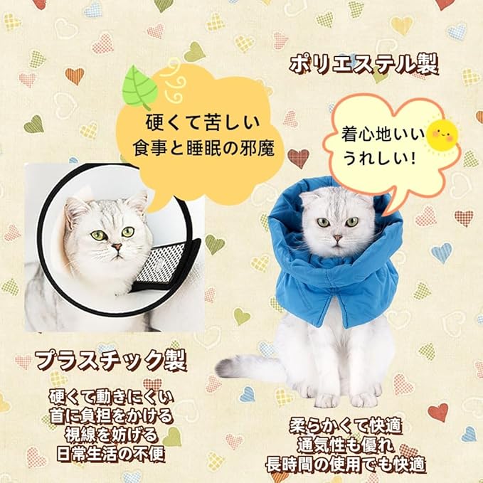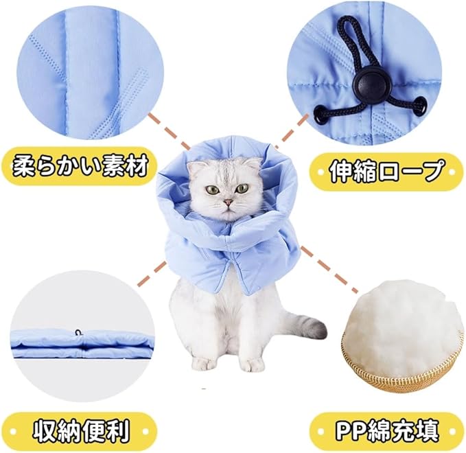 ✅【やわらか素材で快適な着け心地】軽量で通気性の高いポリエステル&PP綿素材を使用し、肌に優しくふんわり柔らか。ペットの首元をやさしく包み込み、長時間の装着でも嫌がりにくく、眠るときもリラックスして過ごせます。猫用エリザベスカラー、犬用エリザベスカラーをお探しの方に最適!