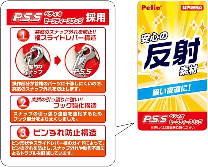編み込まれた反射材で夜のお散歩も安心です。反射の量も増えました。突然のスナップ外れを防止する横スライドレバー構造のP.S.S(ペティオセーフティスナップ)採用! !