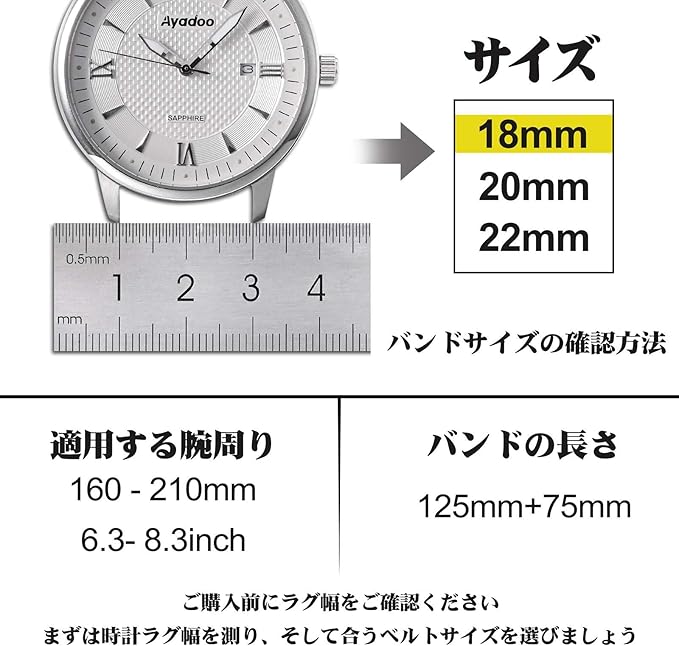 サイズ:バンドの長さは75mm+125mm、参考する手首は6.3-8.3inch(160mm-210mm)。ラグ幅は18mm 20mm 22mmのスプリングバーがある時計に適します。
