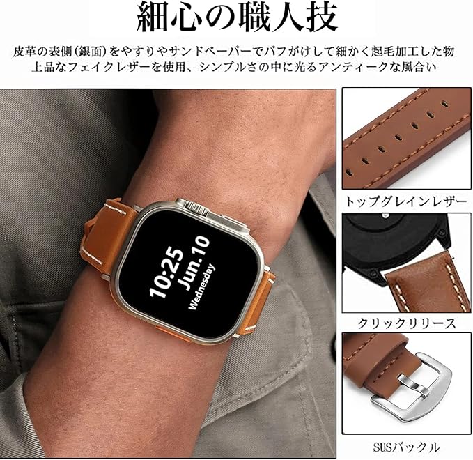 頑丈なクイックリリーススプリングバー: 良質のクイックリリーススプリングバーが付属し、時計ストラップに統合されています。「クイックリリース」は、時計とスマートウォッチをより安全かつ便利に接続し、時計に正確に固定し、取り付けや取り外しが簡単です。