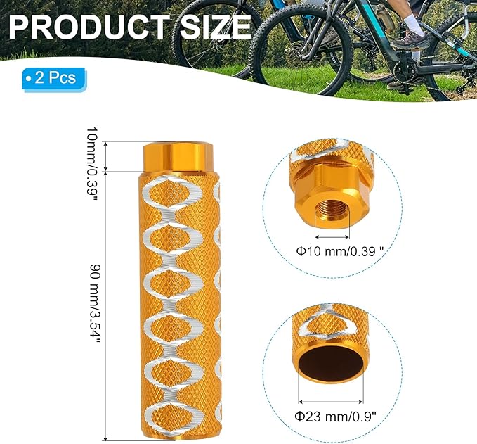 サイズ:カラー:イエロー;材質:アルミニウム合金;全体サイズ:100x28mm/3.9x1.1インチ(長さx幅);穴径:9mm/3/8インチ;パッケージ内容:バイクペグ2個