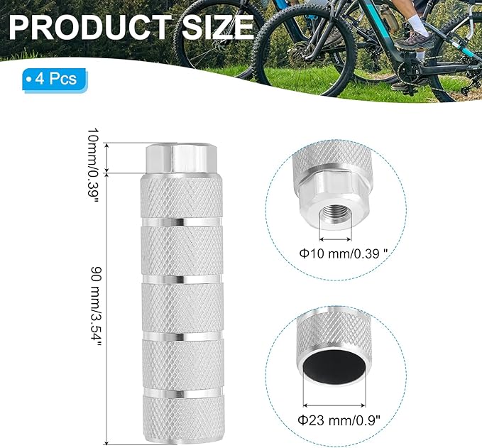 サイズ:シルバー;材質:アルミニウム合金;総サイズ:100x28mm/3.9x1.1インチ(長さx幅);穴径:9mm/3/8インチ;パッケージ内容:バイクペグ2個
