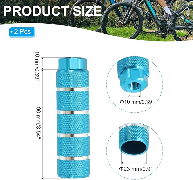 自転車ペグ9mm(3/8インチ)シャフト対応。BMX、マウンテンバイク、一般自転車用に設計されており、前後ホイールアクスルの両方に取り付け可能で、安定したサポートとストッピングを提供します。カラー:スカイブルー材質:アルミニウム合金全体サイズ:100x28mm/3.9x1.1インチ(長さx幅)穴径:9mm/3/8インチパッケージ内容:2xバイクペグフットバイクペグは耐久性、心地よい性、信頼性に優れ、最大200lbs(約90kg)まで耐荷重可能です。前後アクスルに対応し、ツールの携帯も容易で、両足サポートを提供します。後部アクスルにバイクフットペグを取り付ける際は、アクスルの長さが5mm(0.2インチ)以上あることを確認してください。長さが足りない場合は、アクスルのネジを外し、ペグを取り付けて心地よい性を確保してください。定期的にフットペグの状態と締め付けを確認し、心地よいかつ確実に固定されていることを確認してください。