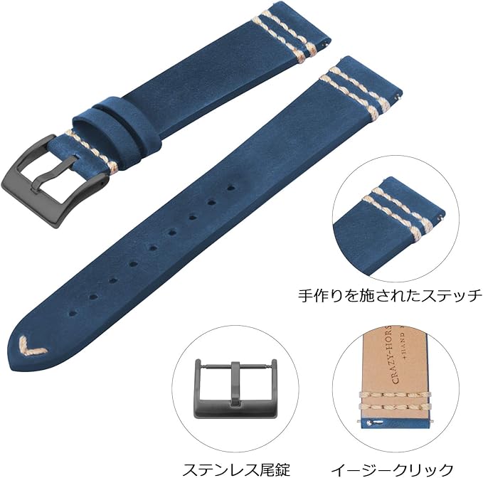 【高級な素材】 表地は高品質なクレージーホースレザー(crazy horse leather)を採用し、裏地は手触りの良い合皮となっております。エンドピース側と剣先側は、シンプルでおしゃれなステッチがあります。このストラップを曲げれば、表面は小さなうひび割れが浮かべっているので(黒と灰色はなし)、プレミアムな感じを与えてくれます。非常に品質感のあるクラシックなストラップです。