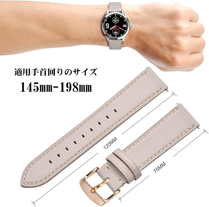 バンド長さは120mm/75mm (美錠を含めず)、適合手首囲は145-198mmです。