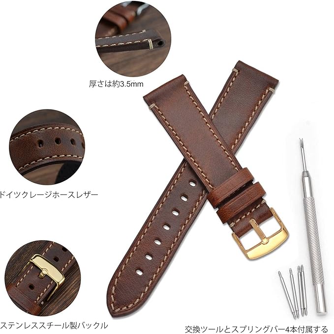 高品質なクレージーホースレザー(crazy hose leather)を使用しています。自然な状態では茶色になってますが、ベルトを曲げると本革特有な筋が出てきます。ステッチされていて頑丈で耐久性があり、質感、縫製が優良な復古風腕時計ベルトです。