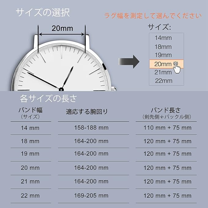 この時計バンドは幅18mm のバネ棒(スプリングバー)を使う伝統的な腕時計やスマートウォッチに適用します。注文する前に腕時計のラグ幅をご確認ください。