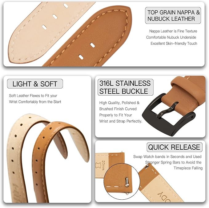 [OTTOODY] 本革時計バンド 時計ベルト22mm 21mm 20mm 18mm 16mm クイックリリース ベルト 男、女性用, エレガント&ソフト カーフレザー 腕時計交換バンド 工具は不要 時計とスマートウォッチ用