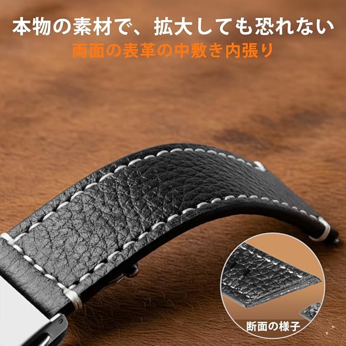 【高品質本革とステッチ採用】 22mm スマートウォッチバンドには、両面本革ライチ柄を使用し、裏地も両面本革を挟み込んだ構造で、厚みは 3mm に達します!柔らかく軽量で、手首に密着して快適な着用感を実現;さらに高靭性のミシン掛け工法を採用し、針目の間隔が均等、針落ちが平行、糸道がスムーズに精密に縫製されているため、バンドが裂けにくく耐用性に優れます。