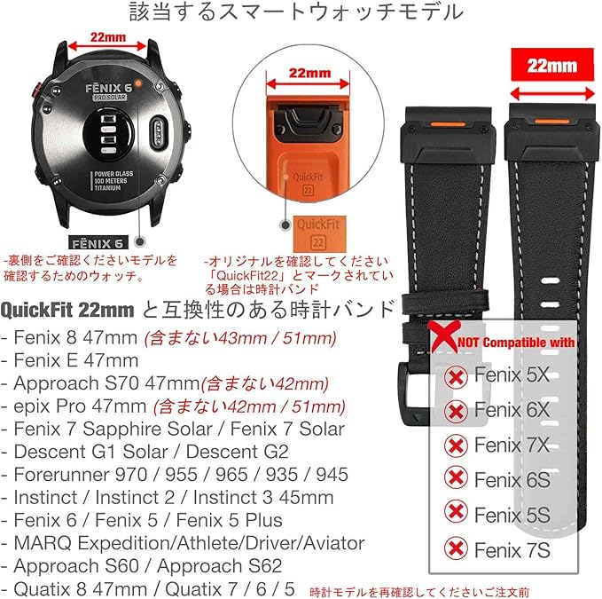 ▲ 互換性のあるモデル、アップグレードされた Quickfit 22mm 時計ストラップ Approach S70 47mm, Fenix 8 47mm, Fenix E 47mm,Instinct 3 45mm, Descent G2,Tactix 8 47mm,Fenix 7 Solar / Sapphire Solar, EPIX(Gen 2) , epix Pro 47mm, Forerunner 955/965, Instinct 2,Descent G1, Fenix 6 Pro/Sapphire,Fenix 5/5 Plus,Approach S60/S62,Quatix 5/Quatix 6,Instinct/Instinct Tactical,Forerunner 935/945,MARQ と互換性があります. 時計ストラップのみ。スマートウォッチは含まれません。