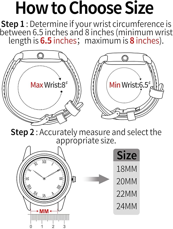 サイズと互換性:この本革時計バンドは6インチから8インチまでの手首にフィットするように設計されており、ほとんどの人をカバーします。精密にカットされたアイレットにより、完璧なフィット感を得るために個人的に調整できます。当社のレザー時計ストラップは、ほとんどのブランドの自動巻き時計、クォーツ時計、または標準的なスプリングバーを備えたスマートウォッチに適合します。