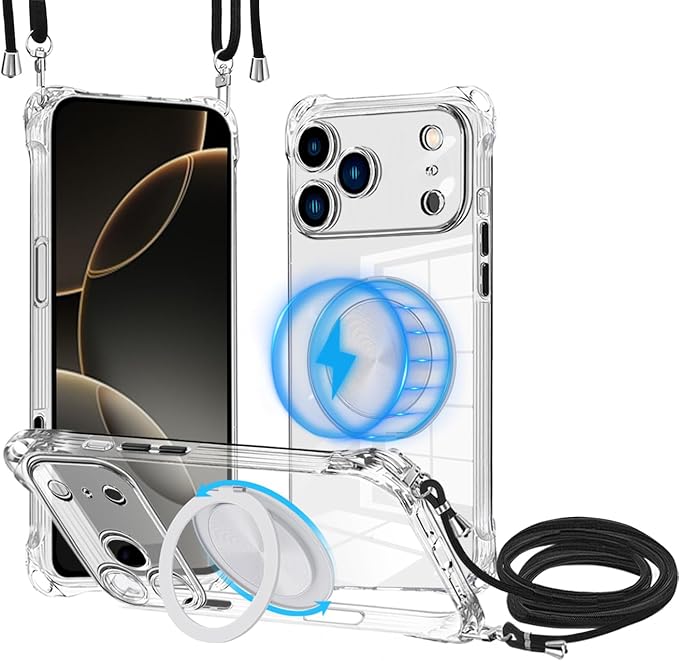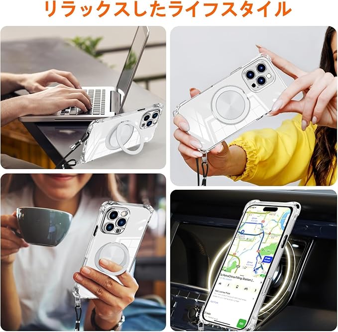 iPhone 17 Pro Max 用 ケース クリア MagSafe対応 リング スタンド 360度回転できる ワイヤレス充電 ネック ショルダー あいほん 17 pro max カバー 肩掛け 首掛け 斜めがけ 紐付き 韓国 耐衝撃 米軍MIL規格取得 スタンド機能 縦横両対応 落下防止 透明 TPU 薄型 軽量 黄変なしスタンド機能車載対応 アイフォン 17 promax スマホケース