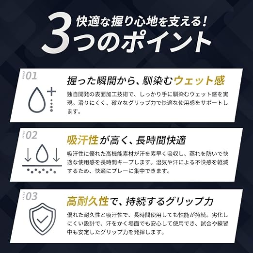 日本国内の会社が1から商品開発した高品質なグリップテープ。某有名なメーカーのカラーやサイズ感、ウェット感を再現。また、品質の持続、持ち歩きに便利な個包装タイプに仕上げました。