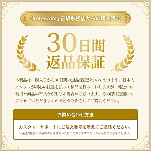 【30日間のメーカー保証付き】 本製品には「KoreColor」正規取扱店からの購入に限り購入日から30日間の返品保証付き。日本人スタッフが1つ1つ丁寧に検品しておりますが、輸送中に破損や不良が出る場合がございます。その場合、迅速にご対応いたしますので、カスタマーサポートからご注文番号を添えてご連絡くださいませ。