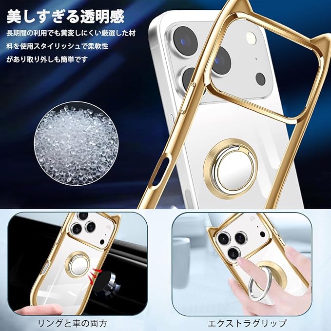 for iPhone 17 Pro Max 専用 ケース クリア カバー TPU 猫耳 リング付き リングホルダ かわいい おしゃれ スタンド付き ストラップホール アイフォン17プロマックス スマホケース 多機能 全面保護 落下防止(ゴールド)