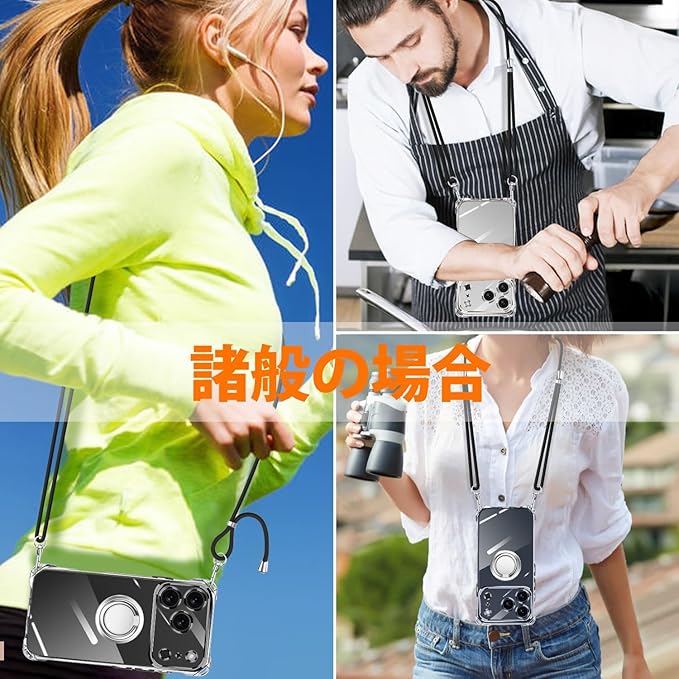 For iPhone 17 Pro Max 用 ケース クリア 透明 リング付き スタンド機能 調節可能な ストラップ付き ショルダー TPU シリコン アイフォン 17 プロ マックス カバー 対応 肩がけ 首掛け 紐付き スマホケース ストラップホール付き 耐衝撃 全面保護 カバー (クリア)