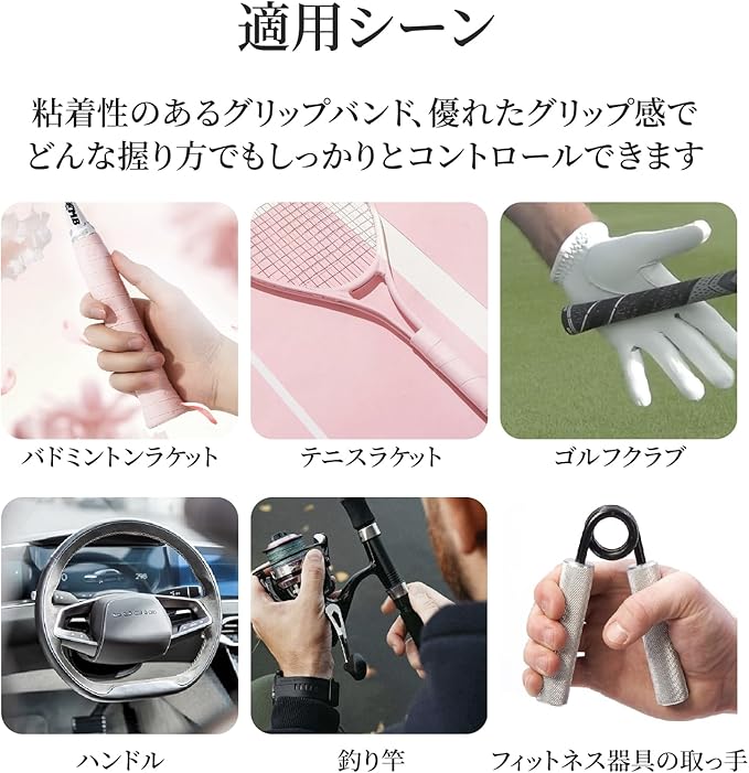【多彩な使用場面】テニスラケット、バドミントンラケット以外にも、釣り竿、ゴルフクラブ、自転車のハンドル、オートバイのグリップ、ドラムスティック、フェンシング道具、トレーニング機器など、様々なアイテムの滑り止めグリップとしてご利用いただけます。携帯に便利で多用途に活躍します。