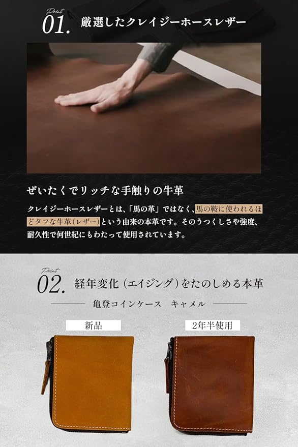 【本革クレイジーホースレザー】牛革の最表面の皮を使用したキーケース。牛革の最表面の皮は繊維が細かく、頑丈で耐久性にすぐれています。本革の中でもクレイジーホースレザーと呼ばれる革を使用して作られています。クレイジーホースレザーは品質の良い牛の原皮(馬の皮ではありません)を使用し、鞣した皮でしっとりとしたやや起毛したような質感が特徴的なレザーです。当スマートキーケースは起毛加工技術を採用し作られており、手触りが滑らかで耐久性にも優れています。「思わず誰かに見せたくなる」そんな革製品を目指して作りました。