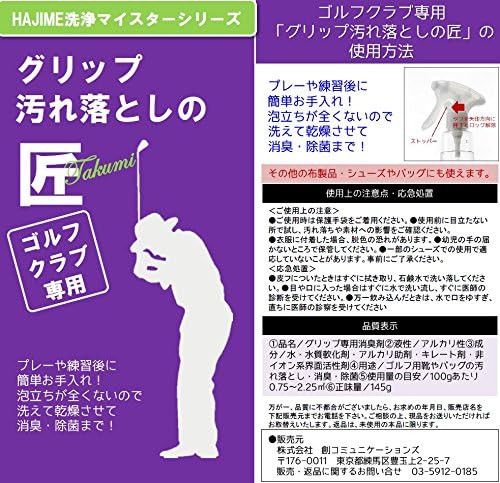 ●品質表示: ①品名/ゴルフ製品(防水皮革・人工皮革)専用水系有機物分解洗浄剤②液性/アルカリ性③成分/水・水質軟化剤・アルカリ助剤・キレート剤・非イオン系界面活性剤④用途/ゴルフ用靴やバッグの汚れ落とし・消臭・除菌⑤使用量の目安/100gあたり0.75~2.25㎡⑥正味量/145g