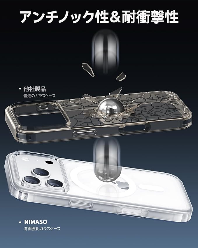 NIMASO iPhone 17 Pro Max 用 ケース MagSafe対応 クリア 背面 強化ガラス 9H硬度 米軍MIL規格 SGS認証 傷つけ防止 耐衝撃 透明 薄型 バンパー 黄変防止 マグネット搭載 マグセーフ対応 保護カバー ワイヤレス充電対応 ストラップホール付き アイフォン17プロマックス 対応(6.9インチ)スマホケース(氷晶シリーズ) NSC25F1631