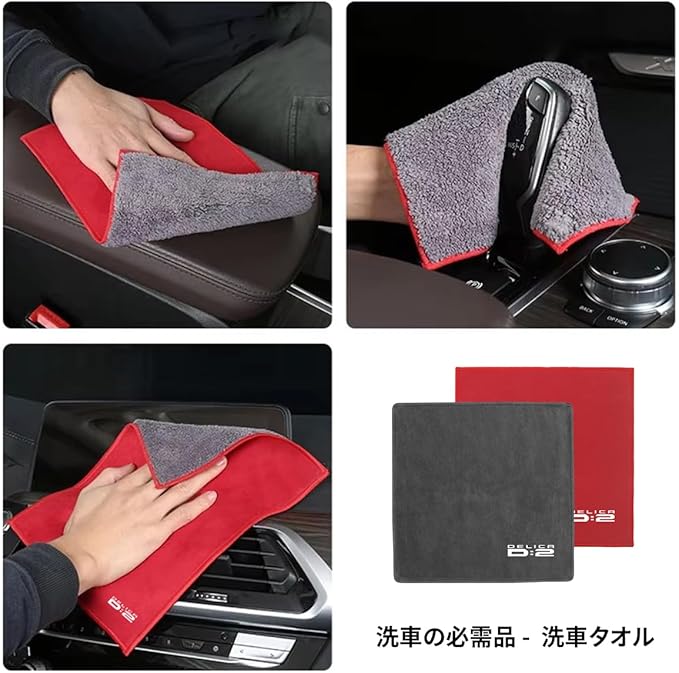 【洗車グッズ・タオル 2個】タオルサイズ:30x30cm レッドとグレー。両面異なる生地で様々な用途に使えるタオルは洗車の必需品です。