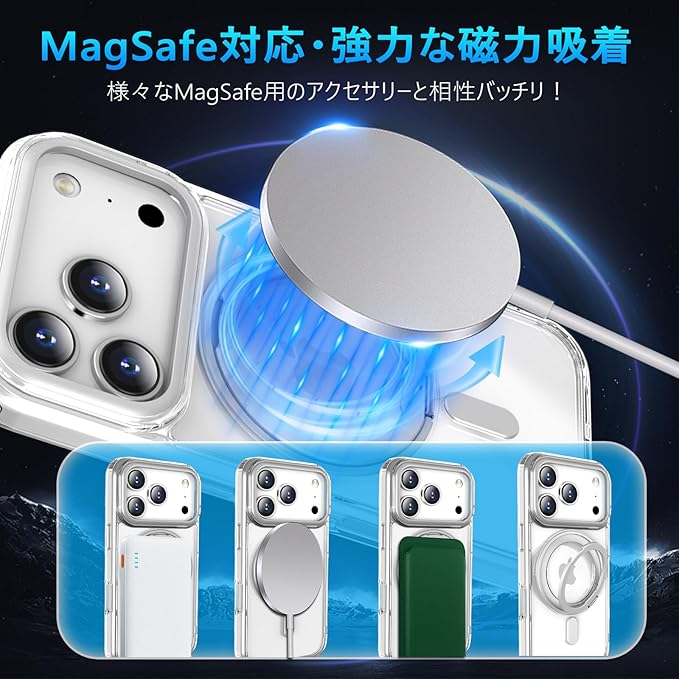 【MagSafe対応・強力な磁力吸着】背面に薄くて強いマグネット内蔵しています、吸着力を高めて、安定感をアップしてエネ損失なしの快速ワイヤレス充電できる。ケースをつけたままマグセーフ機能を快適に使用できます。車載ホルダーでの使用時もとても安心感溢れ、様々なMagSafe用のアクセサリーと相性バッチリ!より安全、安定、急速なワイヤレス充電体験をもたらします。ご注意:この製品はすべての Magsafe デバイスと互換性がありますが、Qi フイャレス充電には適していないため、購入する前にこの点を考慮してください。