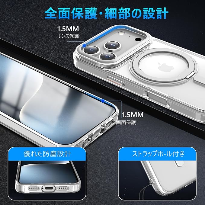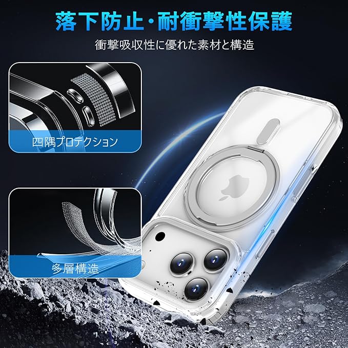 QUEASON【iPhone 17ProMax 用 MagSafe対応 ケース】360 回転スタンド ワイヤレス充電対応 いphone17promax 用 ケース リング付き 米軍MIL規格 iphone 17 pro max 用 スマホケース magsafe 超強磁力 落下防止 iphone17プロマックス 用 スマホケース 耐衝撃 半透明 防指紋(クリア)
