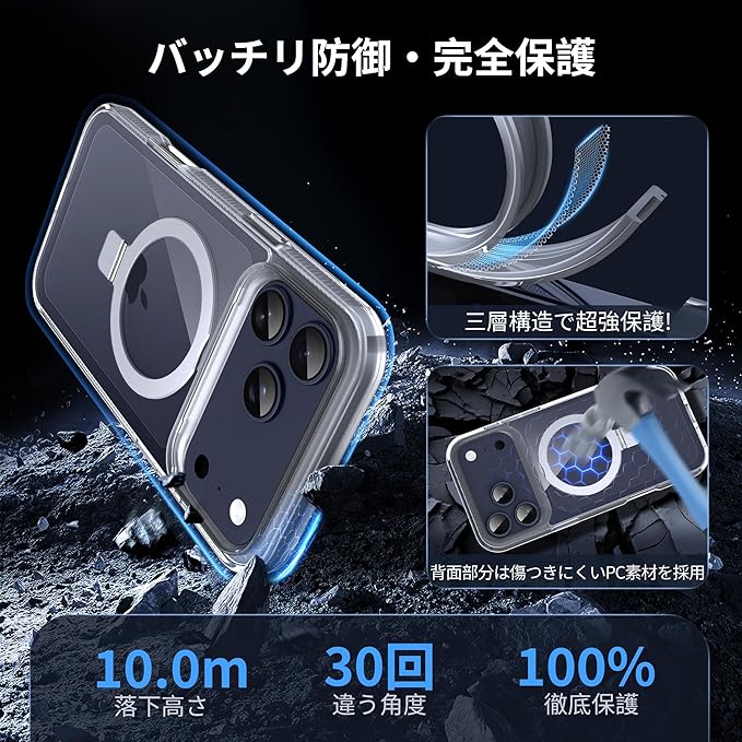 【米軍MIL規格の耐衝撃性能】米軍MIL規格に準拠した耐衝撃構造を採用しており、落下時のダメージを最小限に抑えます。高所からの落下にも耐えられるため、安心して日常使用が可能です。スマホをしっかりと守る高耐久性もポイントです。