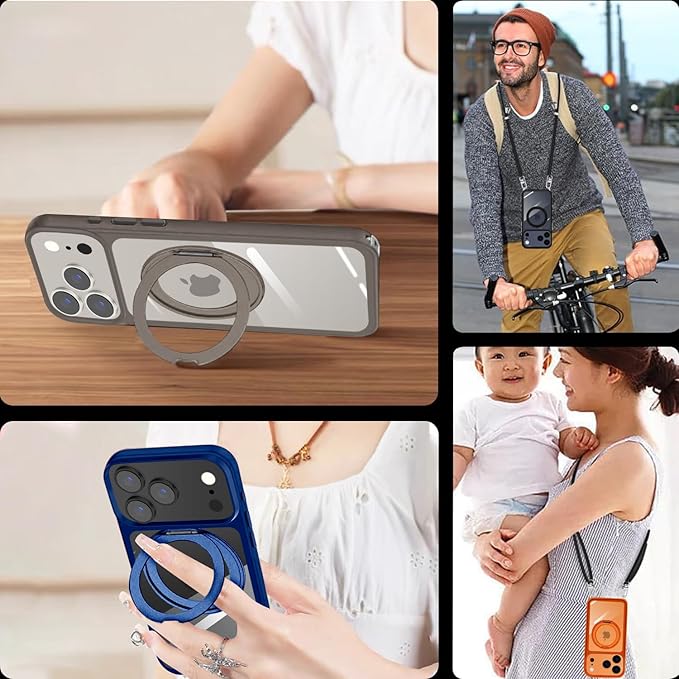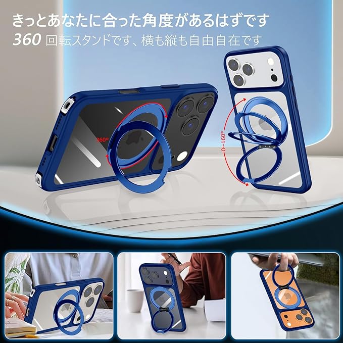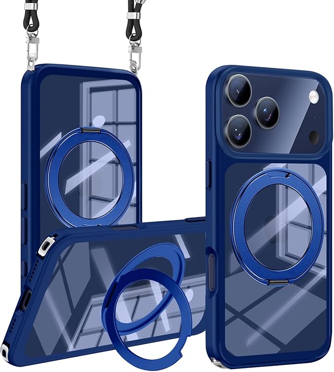 For iPhone 17 Pro Max 用 ケース クリア ショルダー 多機能360度回転スタンド MagSafe対応 調節可能 ストラップ付き ワイヤレス充電 耐衝撃 カメラレンズ保護 いphone17 プロ マックス 対応 マグセーフ マグネット搭載 透明 PC + TPU 肩がけ 首掛け 紐付き 耐衝撃 全面保護 おしゃれ アイフォン カバー (ブルー)