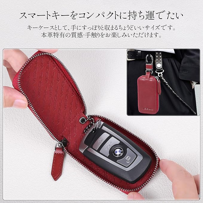 【天然牛革 】天然皮革を使用する製品のほとんどが、天然皮革ならではの風合いを生かして作られています。でもその仕上がりの美しさ、そして経年変化で得られる深い味わいは、きっと手に取ってくれたあなたの心に深く刻まれる物になるはず。【360度回転カラビナ】カラビナが360度回転タイプで、手のひらサイズ利用する時にはとても便利です。ズボンやバッグなどに引っ掛けることができ、普段の持ち運びに活躍します。【チェーン付きリング】ケース内にスマートキーを繋ぎとめるチェーンを付き、万が一、ファスナーを閉め忘れた時に、キーの落下を防ぎできます。